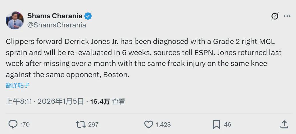北京时间1月5日上昼,据NBA名记Shams报说念,快船时尚小德里克-琼斯被会诊为右膝内侧副韧带二级扭伤,将在6周后吸收复查。这也曾是琼斯本赛季第二次遭受右膝伤势了,上周他刚刚复出,如今又一次因膝伤休战。