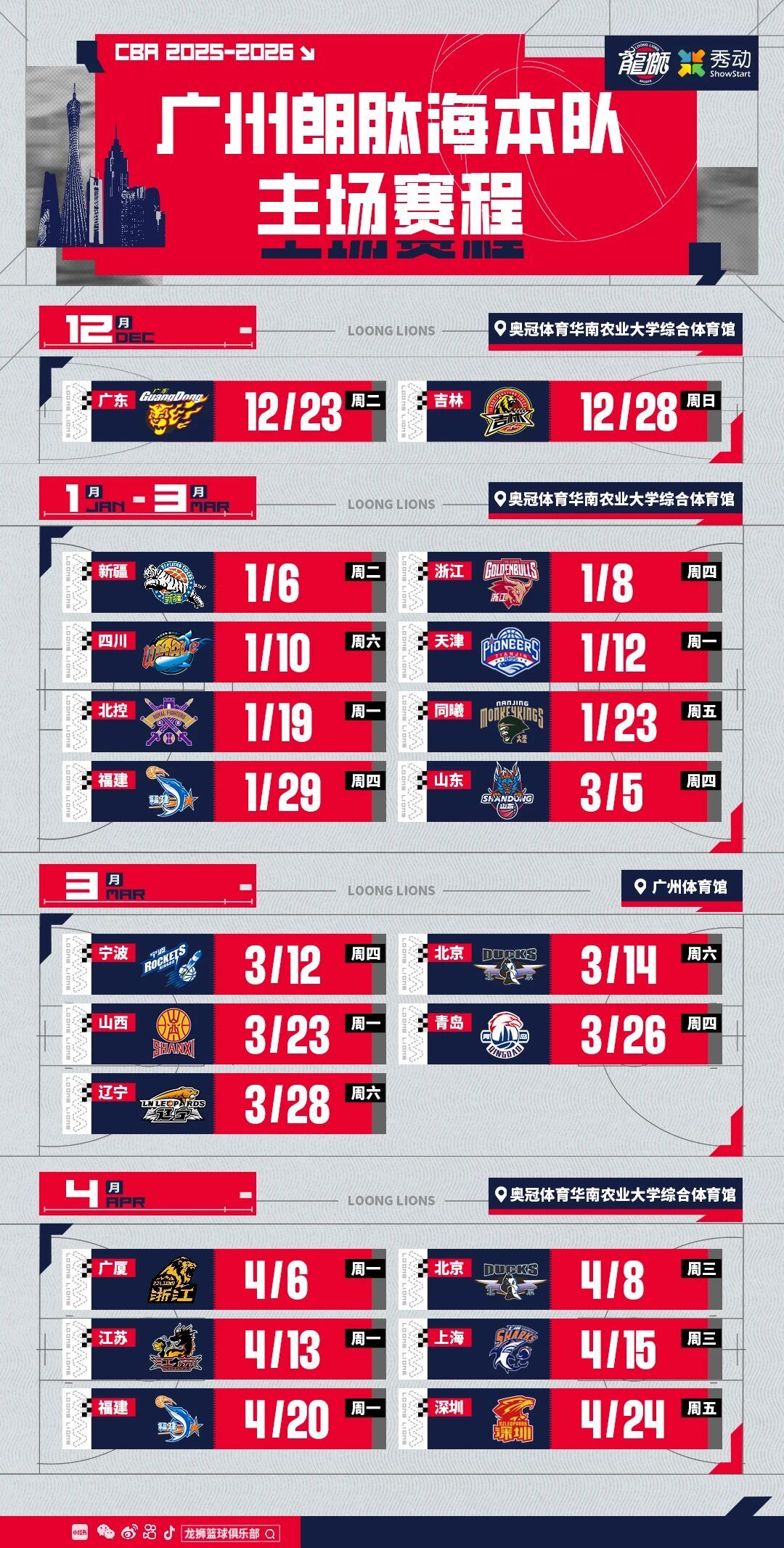 广东三家俱乐部的赛程已扫数出炉。广东东阳光首战将对阵南京天之蓝男篮,比赛将于12月14日打响;广州朗肽海男篮首战对阵广东东阳光,比赛将于12月23日打响;深圳马可波罗男篮将在12月13日镇守主场,迎来与青岛队的赛季首战。