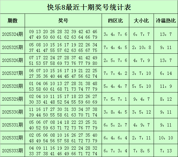 福彩称心8第2025333期开奖总结:04 09 11 16 19 20 22 24 28 32 33 37 38 41 46 49 66 71 72 74,其中奖号四区比为6:7:3:4,冷温热码比为7:8:5,大小比为7:13,和值为712,同尾号码为11 41 71、22 32 72、04 24 74、16 46 66、28 38、09 19 49。
