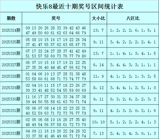 福彩安稳8第2025333期奖号为:04 09 11 16 19 20 22 24 28 32 33 37 38 41 46 49 66 71 72 74,其中奖号大小比为7:13,八区比为2:4:3:4:3:0:1:3。