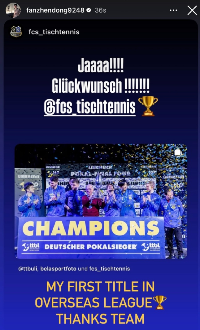 赛后樊振东在个东说念主的IG上发布了我方夺得德国杯冠军的音书,小胖让出了合影的C位,小胖真实是一位超等优质的偶像,全场5000多位不雅众一同为他唱起了中语歌曲。
