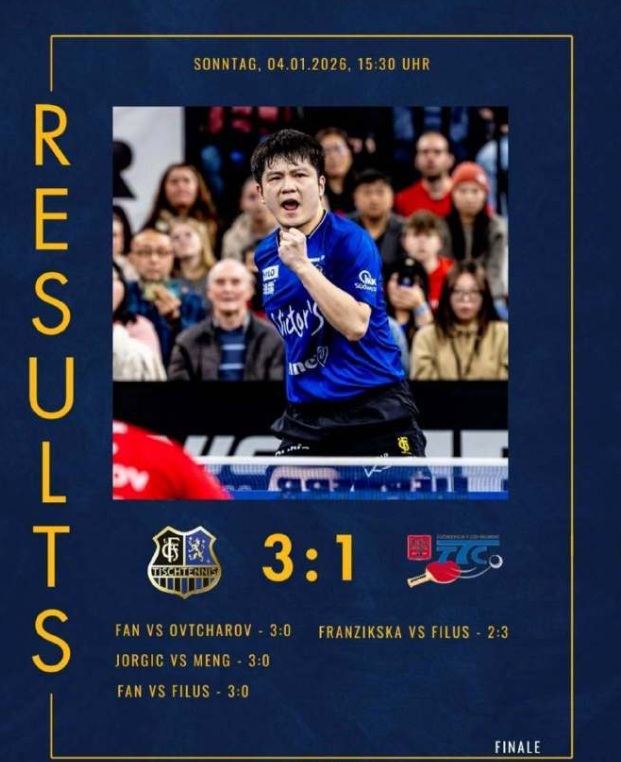 北京时期1月5日凌晨,德国杯决赛,3-1打败富尔达马伯策尔夺冠,中国球员迎来了留洋糊口的首个冠军,决赛樊振东亦然一东说念主独取两分红为第一元勋。