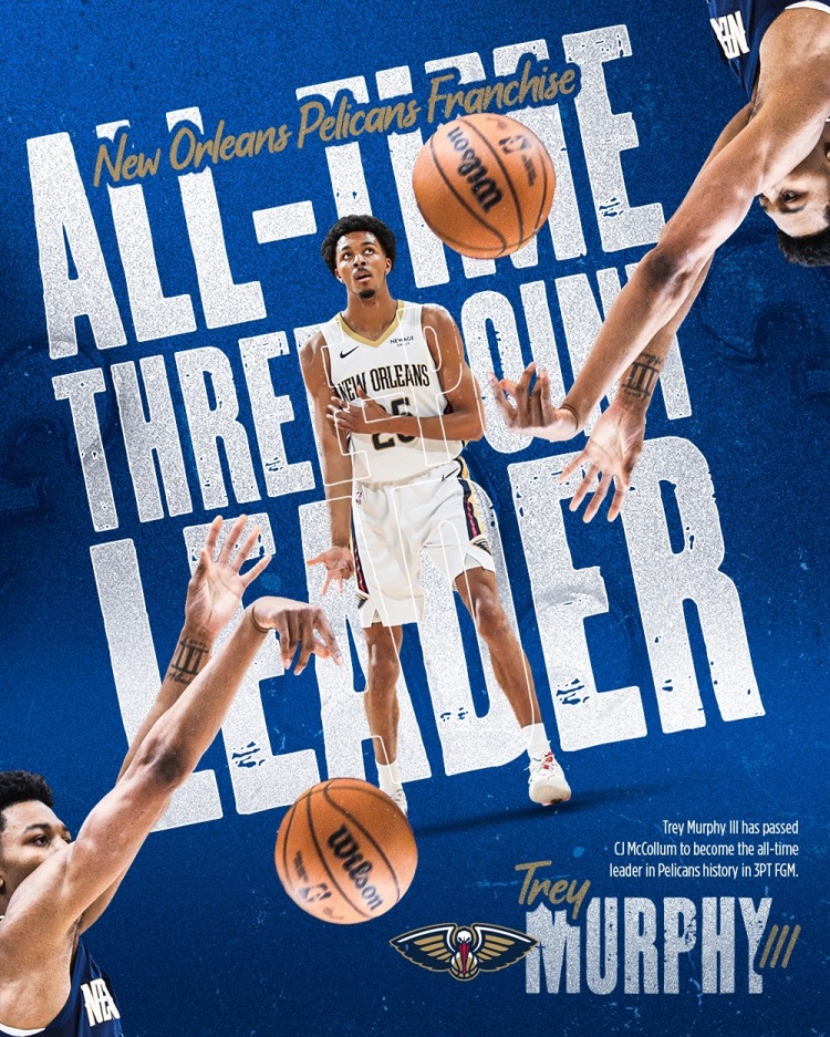 鹈鹕官方晒出相片,道贺墨菲登顶队史三分射中数第一的宝座!榜单具体如下: